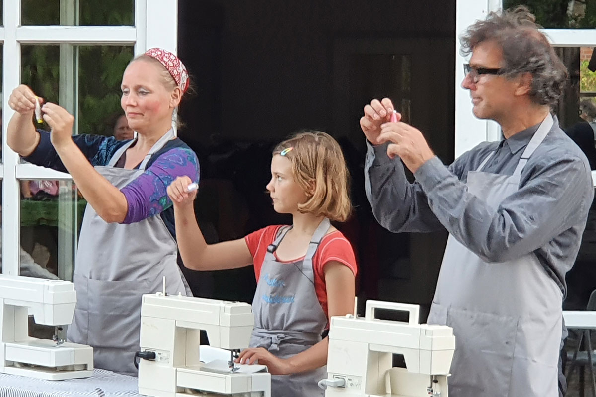 Das neueste Projekt von Kalumalu ist ein textiles Theater-Unternehmen im ländlichen Raum. „Margaretes Schneiderei“ holt die Produktion zurück ins Dorf und die Stadt und rettet Kleidungsstücke. Und alle sind aufgerufen mitzumachen: Das Publikum leert Schränke und wird während des Welttheaters Teil der Produktion. Bis zu sieben Kleidungsstücke können zum Verschenken, Verschönern und Verwerten abgegeben werden, mitmachen können alle. Auf ins textile Abenteuer: Schneiden, reißen, weben, bügeln oder nähen, Kordeln drehen, Maß nehmen & mit Wimpeln wehen. Inklusive Nähmaschinen-Ballett, Kleiderwechsel und mehreren Metern Vernetzung mit T-Shirt-Garn.