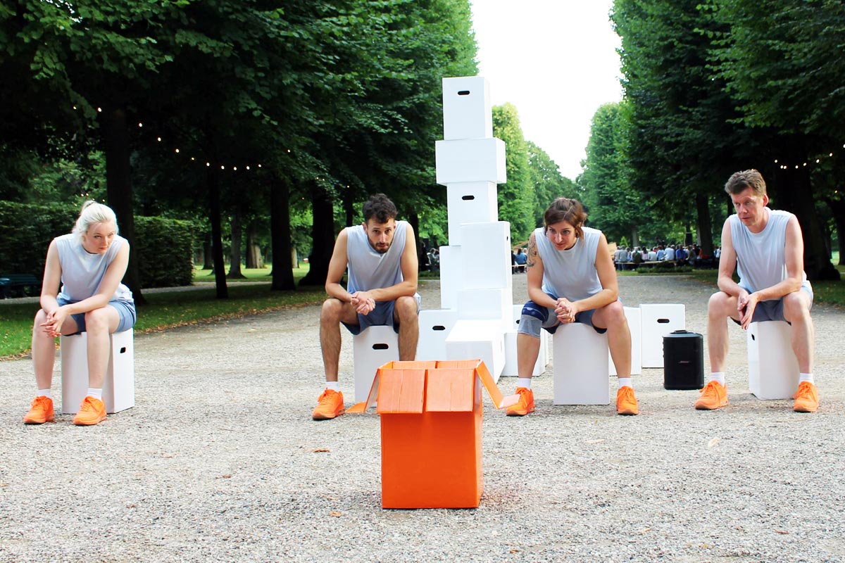 Eine Performance über die spontane Begegnung - offen, angstfrei und spielerisch. Fünf Künstler:innen und ein Stapel weißer Pappkartons bilden den Startpunkt für eine Jonglierperformance, die Neugier weckt. Das Publikum wird fröhlich in das Spiel aus Tragen, Werfen und Stapeln einbezogen - der Raum verändert sich ständig und lädt zum Neudenken ein. Jonglieren wird zu einem faszinierenden Gespräch zwischen vorher fremden Menschen, in dem jede:r zu Wort kommen kann.